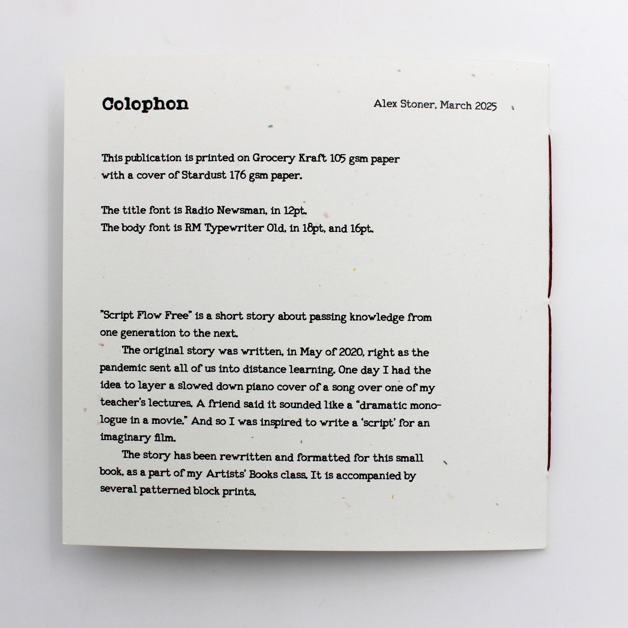 “The original letterpress edition of this book was designed, printed, and bound by Leah Klister in the fall of 2023 at the Minnesota Center for Book Arts in Minneapolis [as part of the 2023 MCBA/Jerome Book Arts Mentorship series.] [This book] is a digital version of the original version, printed at Smart Set in Minneapolis.